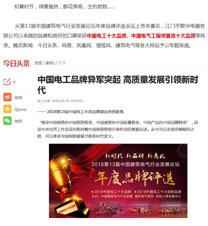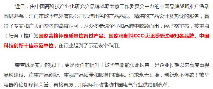 初夏时节,绿意盎然,群花争艳,生机勃....从第13届中国建筑电气行业发展论坛年度品牌评选会议上传来喜讯,江门市敏华电器有..