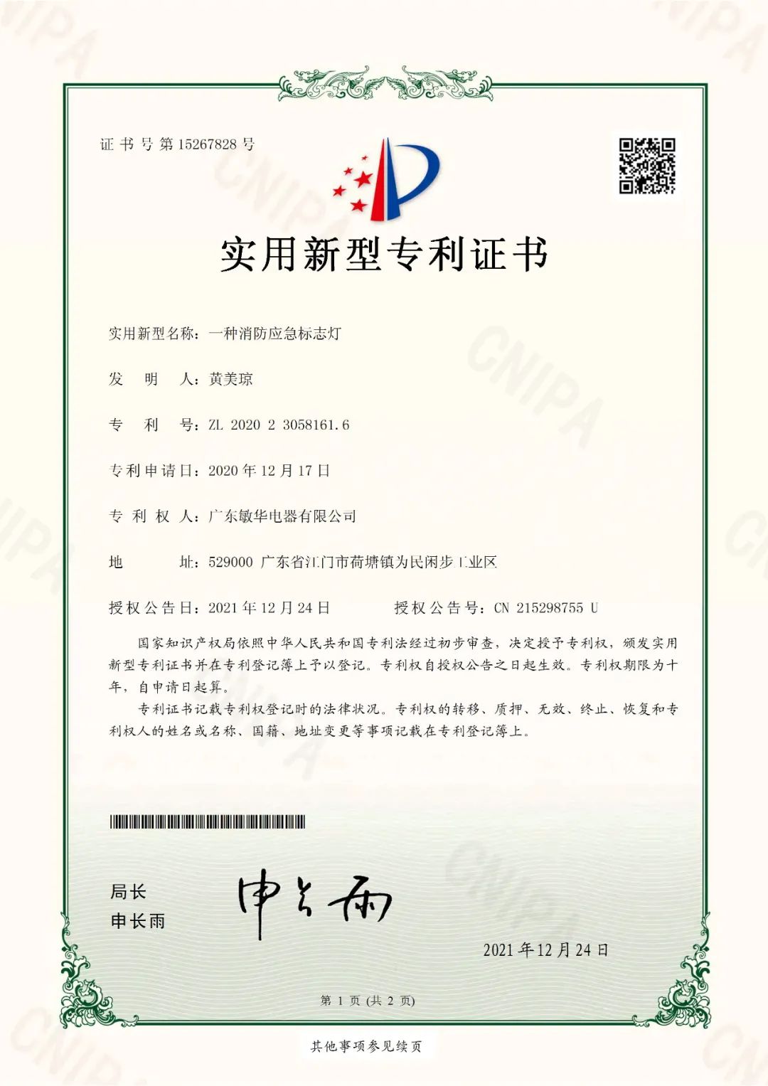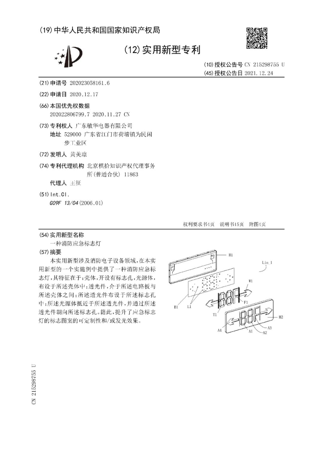 针对以上不足,敏华早在2020年就开始研发可调楼层指示灯,同时申请了专利,并获得国家知识产权局颁发的实用新型专利证书(专利号:2020230581616)。