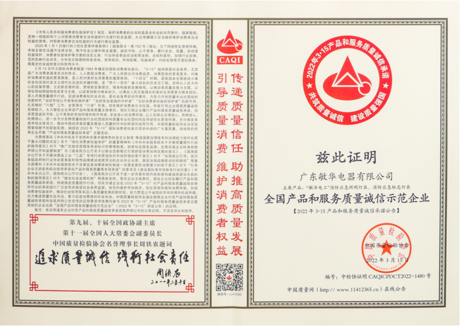 质量追求永无止境,质量提升必须持续发力!近日,在国家市场监督管理总局·中国质量检验协会开展的2022年“3.15”国际消费者权益日“产品和服务质量诚信承诺”主题活动中,经过专业评委的严格审查和层层筛选,敏华凭借卓越的品质和热忱的服务,再次荣获由中国质量检验协会颁发的“全国产品和服务质量诚信示范企业”、“全国产品和服务质量诚信领先品牌”、“全国质量检验稳定合格产品”、“全国质量检验信得过产品”等一系列殊荣,为营造公平、公正、诚信经营的市场环境,广泛凝聚社会共识,传递消费维权正能量做出了表率作用。《中国质量报》《中国消费者报》、人民网、新华网、中国经济网、中国消费网、中国质量网等多家权威媒体均予以集中展示和公告。