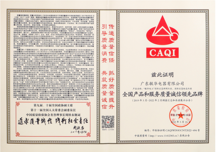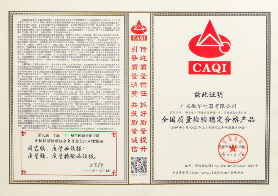 质量是人类社会的不懈追求,质量既表现为产品质量,也表现为服务质量,产品质量是企业应该履行的基本社会责任,服务质量是产品质量的延伸。质量诚信是社会信用体系的重要基础,确保质量诚信既是承担质量主体责任的企业应该切实履行的法律和社会责任,也是安全生产和放心消费的关键因素,还是企业发展的重要保证,更是承担社会责任的企业应该对消费者和社会的必然承诺。 作为消防应急照明和疏散指示系统行业的龙头企业,敏华秉持“以人为本、信守承诺、持续创新、匠心制造”的理念,坚持以顾客需求和社会责任为导向,以满足消费者日益增长的美好生活需要为己任。敏华凭借领先的产品和技术及严格的品质管控措施,获得了众多大型工程的首选和认可。目前,公司自主研发的2000多款全系列产品可满足不同层次的市场需求。