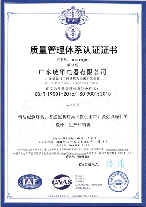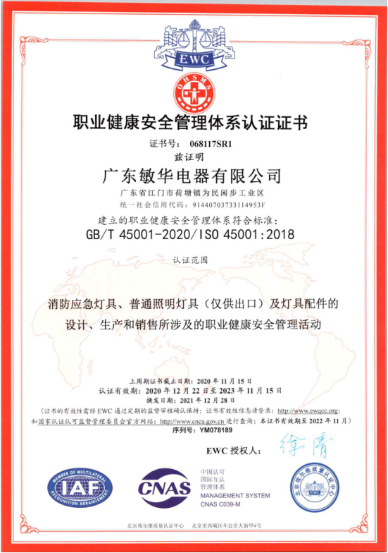 2022年1月,经北京埃尔维质量认证中心(EWC)全面、严格的评定与审核,敏华再次顺利通过ISO9001:2015质量管理、ISO45001:2018职业健康安全管理等国际管理体系认证!这是对敏华一直以来坚持标准化管理的又一次充分肯定,再次印证了敏华在质量管理和职业健康安全管理方面已达到国际先进水平。