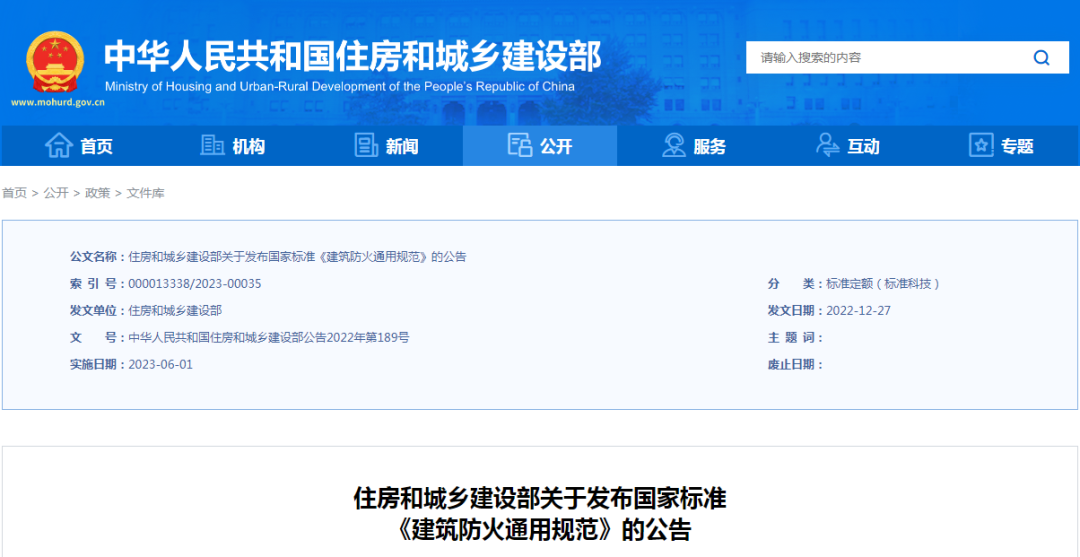2023年1月19日,住建部发布国家标准《建筑防火通用规范》,编号为GB 55037-2022,自2023年6月1日起实施。