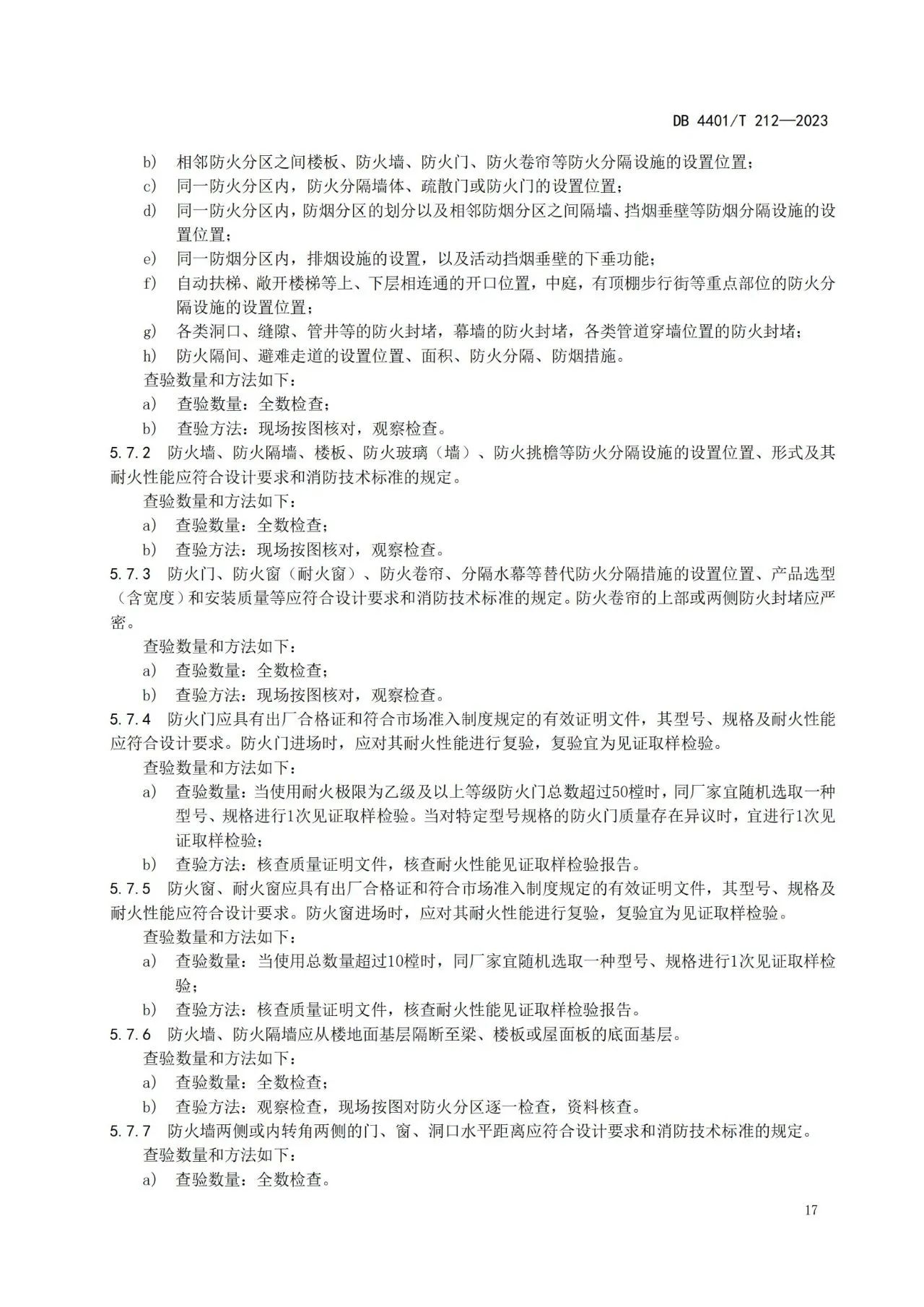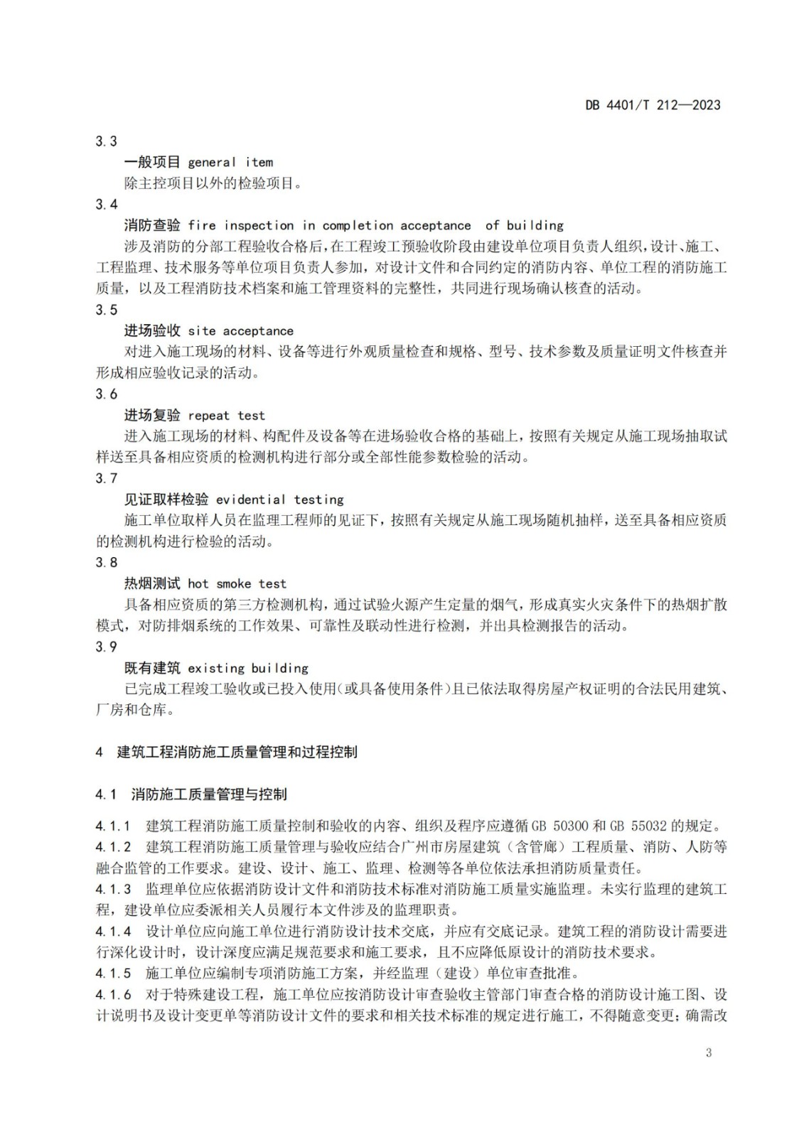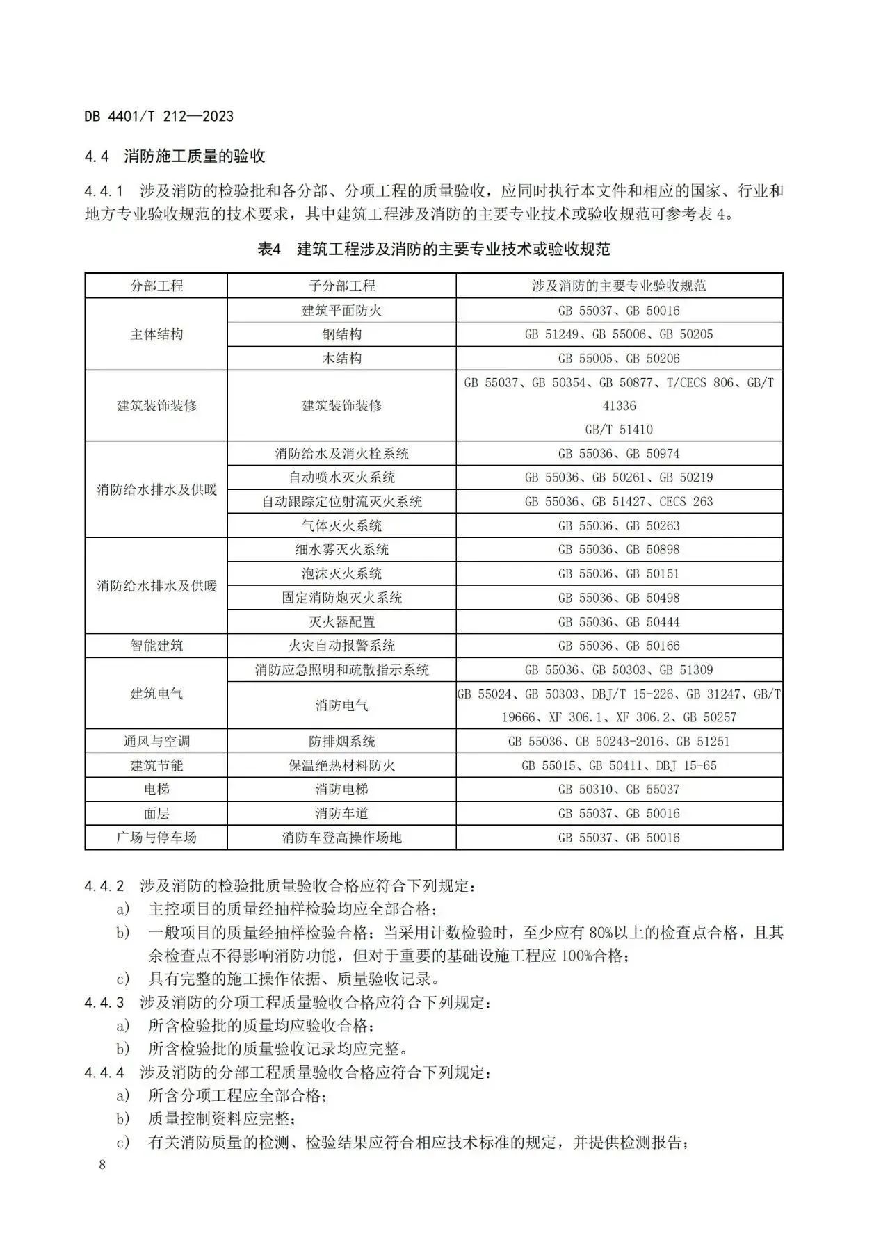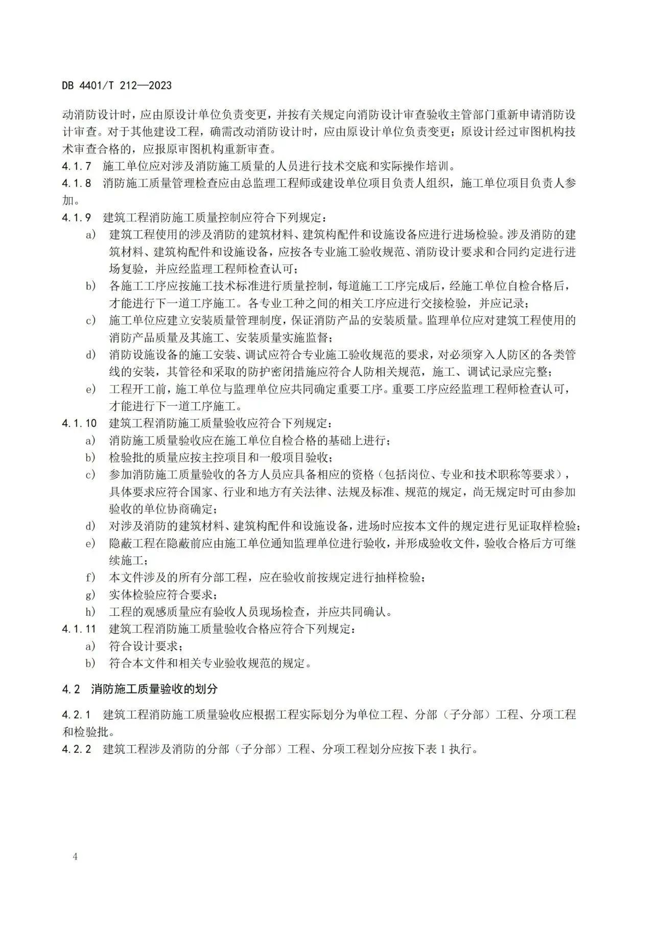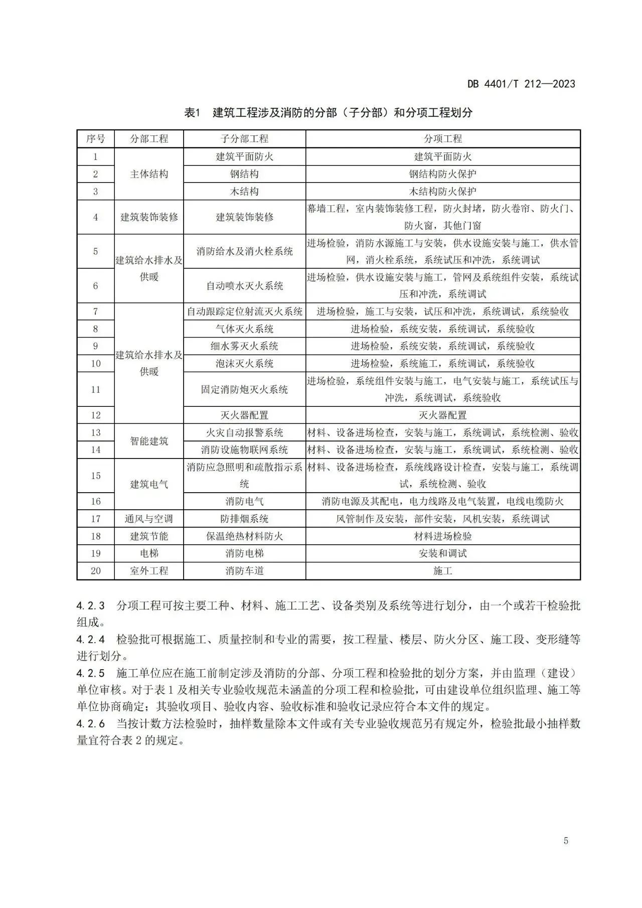 第一,遵循广东省标准《建筑工程消防施工质量验收规范》(DBJ/T15-248-2022)的一般规定,划分了涉及消防的分部分项工程,完善了消防检测要求,从而将消防质量验收内容纳入到现有建筑工程质量验收技术体系,为各方责任主体实施消防施工质量过程控制提供了依据。