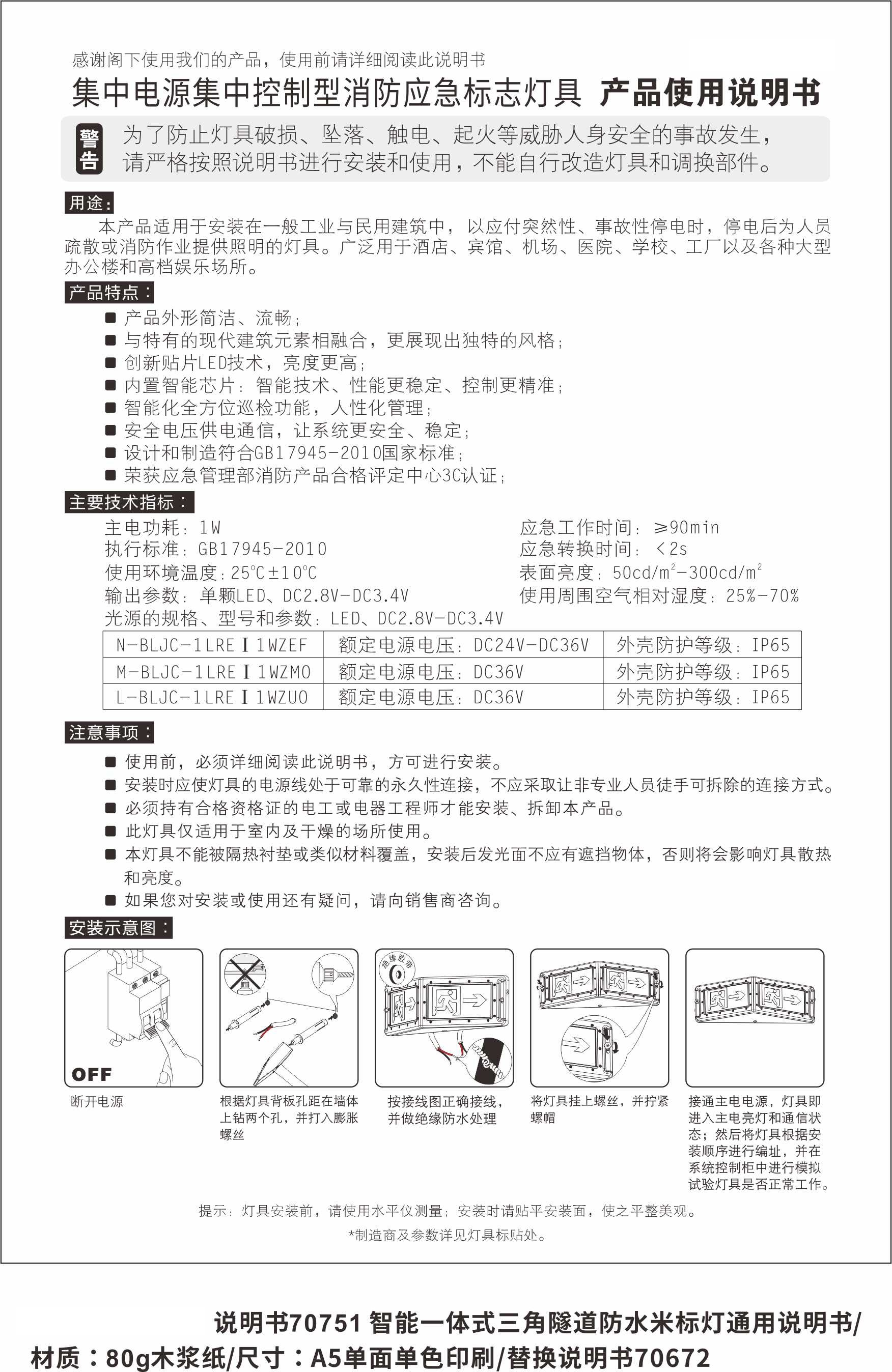 | 322 | M6204 | M6204(M-BLJC-1LROEⅠ1WZLC)集电集控单面防水隧道标志灯/R5图/不锈钢面板 | 【材质】拉丝无指纹亮油不锈钢 【防护等级】IP65 【安装方式】挂墙式 【额定电压】DC36V 【主电功耗】1W 【LED光源】高亮、低功耗LED 【外形尺寸(长×宽×厚)】272*154*40mm 【挂墙尺寸】96/70mm 【包装数量】10台 | ![]() |