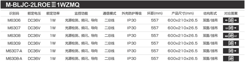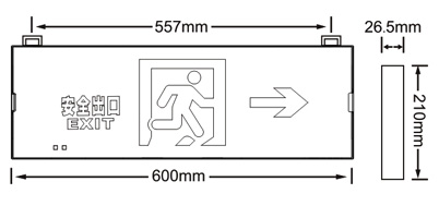 【材质】防火塑料+拉丝铝面 【防护等级】IP30 【安装方式】挂吊式 【额定电压】DC36V 【主电功耗】1W 【LED光源】高亮、低功耗LED 【外形尺寸(长×宽×厚)】600*210*26.5mm 【吊杆孔距】557mm 【包装数量】10台