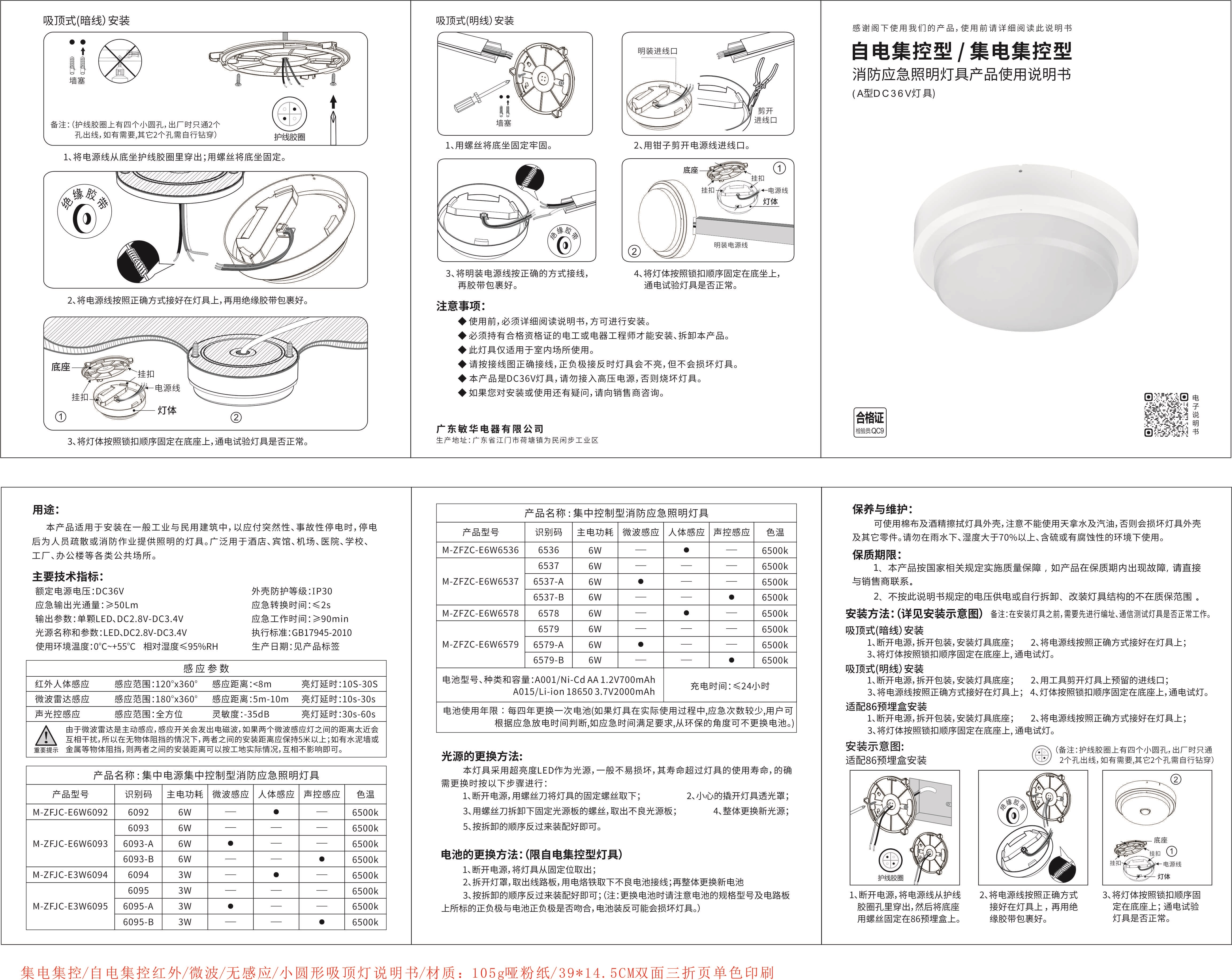 【材质】防火塑料 【防护等级】IP30 【安装方式】吸顶式 【额定电压】DC36V 【主电功耗】3W 【LED光源】高亮、低功耗LED 【光通量】≥450Lm 【感应方式】人体感应 【色温】6500K 【外形尺寸(直径×高)】Ф150*51mm 【包装数量】20台 | 【材质】防火塑料 【防护等级】IP30 【安装方式】吸顶式 【额定电压】DC36V 【主电功耗】6W 【LED光源】高亮、低功耗LED 【光通量】≥860Lm 【感应方式】人体感应 【色温】6500K 【外形尺寸(直径×高)】Ф150*51mm 【包装数量】20台 |